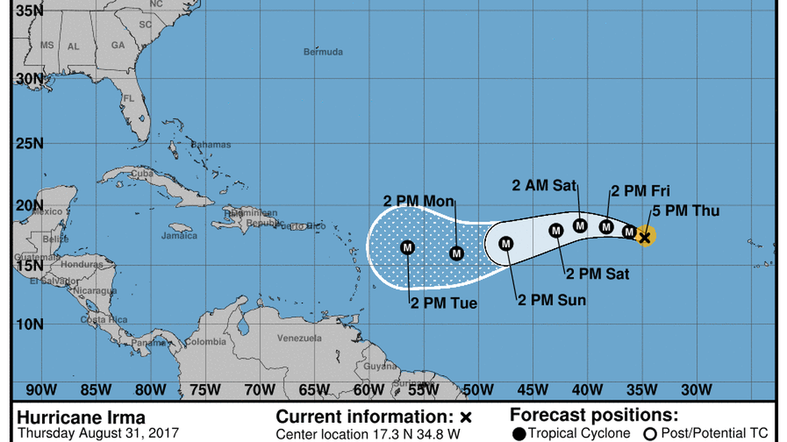 What impacts Irma poses to land remain unclear. Models are notoriously unreliable more than five days away, and Irma is not expected to near the Leeward Islands until sometime next week.