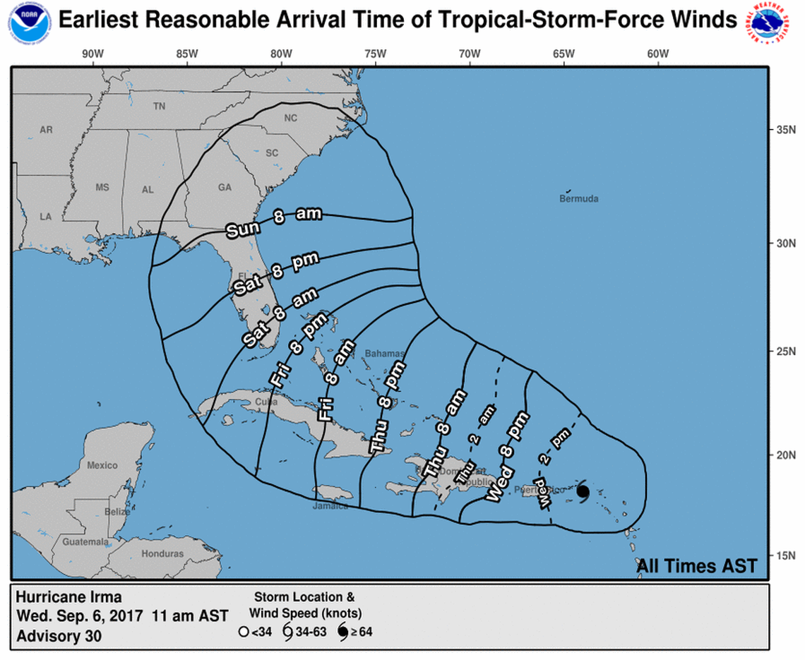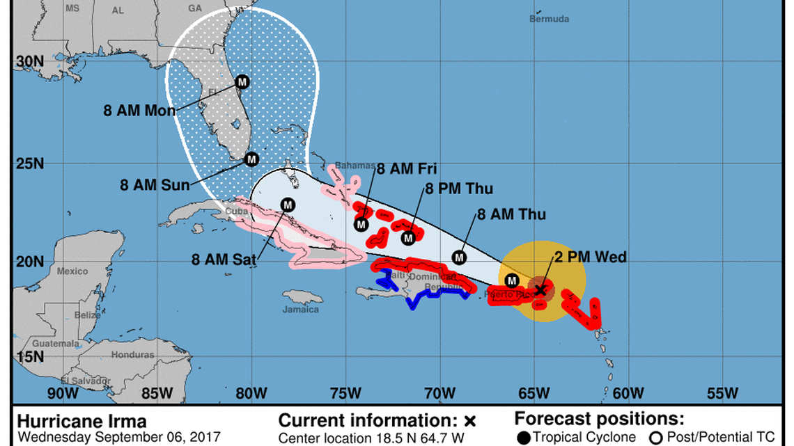 In an 11 a.m. discussion, National Hurricane Center forecasters said the latest model runs show Irma heading to north-northwest over the next two to three days toward Florida with a good amount of certainty. But where the storm heads after that still depends on where it is steered by a trough moving across the U.S.