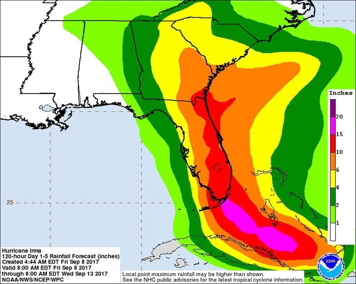 South Florida could also get heavy rain, with 10 to 15 inches across the Upper Keys — and up to 20 inches possible in some places — and up to 12 inches on the east coast, with 16 inches in some locations.