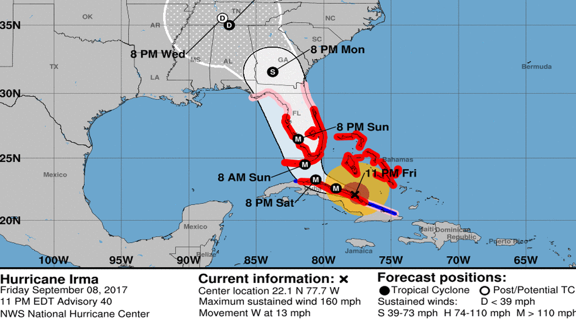 Where the storm will make landfall in Florida remains uncertain, but the latest forecast suggests Irma is heading west — and away from the heavily populated coast of Miami. On its projected track, Irma could make landfall somewhere in the Middle Keys early Sunday morning with potentially catastrophic winds, then continue toward the Southwest coast in the afternoon.