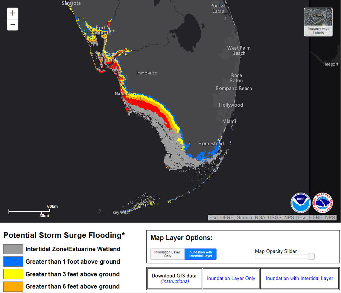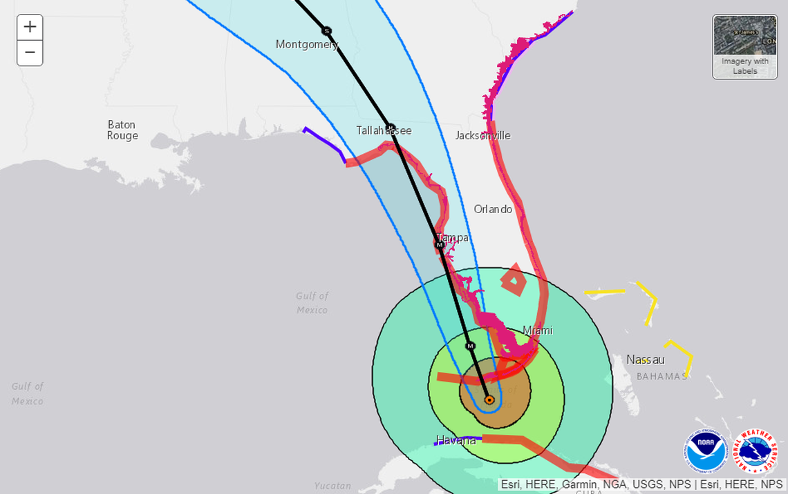 While the forecast track shows the storm’s center crossing south of Big Pine, fierce winds and storm surge will likely be widespread. Water could be as high as 10 feet throughout the Keys. From Card Sound Road to Miami Beach, a four- to six-foot surge is possible, hurricane center officials said.