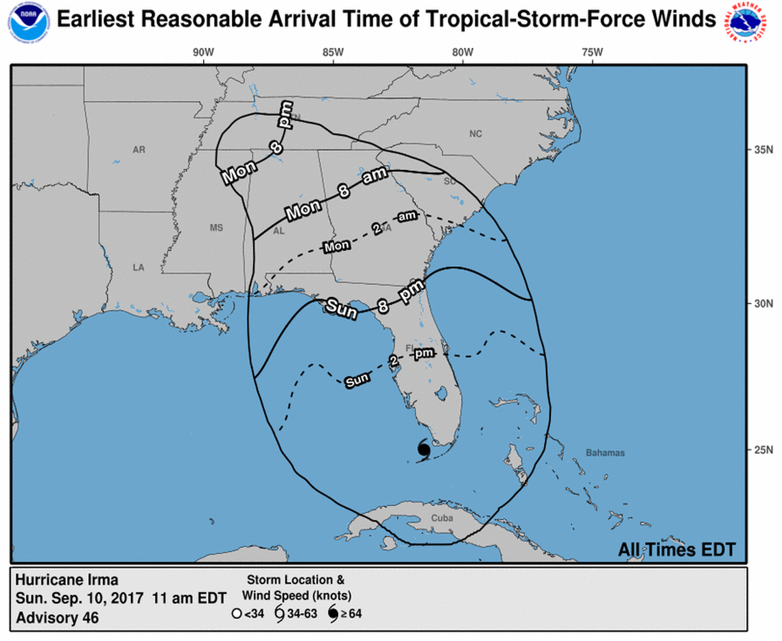 At 11 a.m., Irma was located 80 miles southeast of Naples moving at 9 mph, National Hurricane Center forecasters said in the latest advisory. Irma should near the west coast by this afternoon or later tonight, with hurricane winds extending 80 miles from the center and tropical storm winds reaching 220 miles.