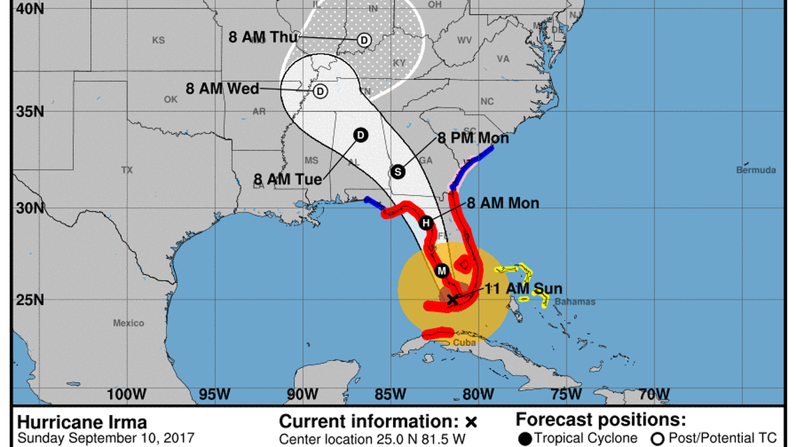 “Life-threatening wind and storm surge from Irma will continue in the Florida Keys and southwestern Florida today and spread into central and northwestern Florida tonight and Monday,” forecasters said.
