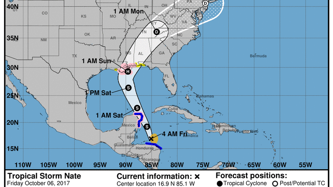 At 5 a.m. Friday, Nate had maximum sustained winds of 45 mph and was likely to strengthen over the northwestern Caribbean Seabefore a possible strike on the Cancun region at the tip of Mexico’s Yucatan Peninsula at near-hurricane strength. It could hit the U.S. Gulf coast near New Orleans.