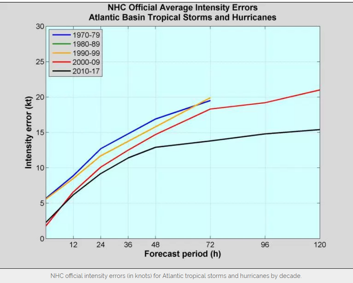 In recent years, National Hurricane Center forecasters have dramatically improved track predictions. Tracks are 30 to 40 percent more accurate than they were just two decades ago. But gains in intensity have been smaller, with the average error at 72 to 120 hours out still off by one category. Forecasters say that's due to the complexity of balancing broader environmental conditions within the narrower confines of the storm's structure, and they warn ultimately they will reach the limits of predictability.