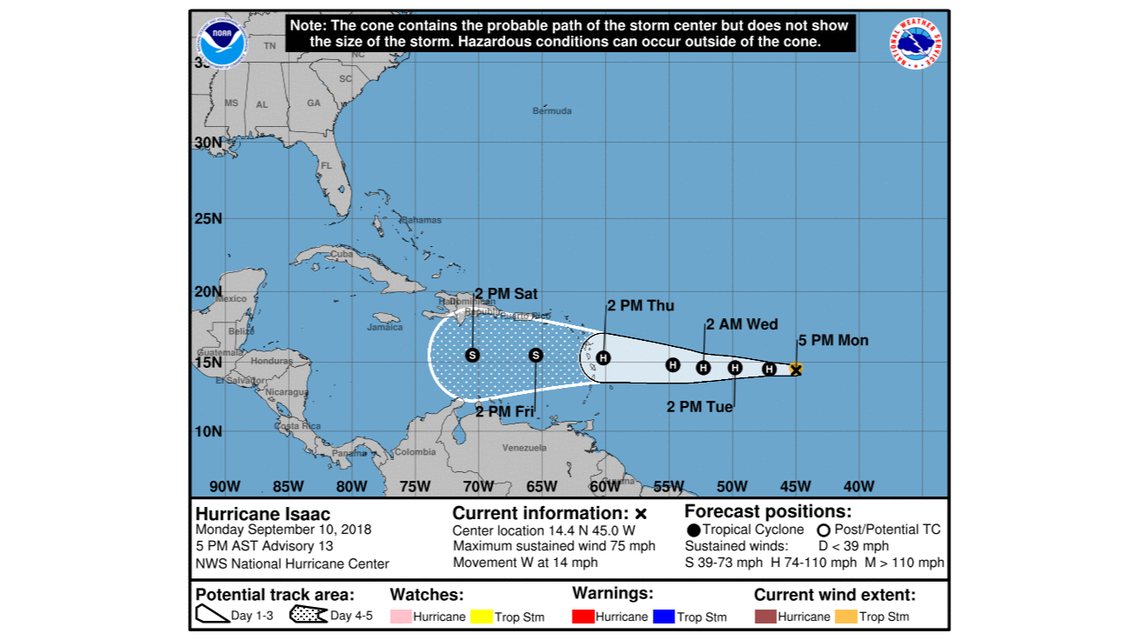 Because the storm is so small, forecasters are less certain about how intense Isaac may become. It’s expected to strengthen over the next couple of days as it faces little wind shear. But after that, outflows from Florence could weaken it. But small storms tend to grow and shrink more rapidly than large storms. It’s still likely to be near or at hurricane strength when it crosses the islands, forecasters said, with winds around 90 mph.
