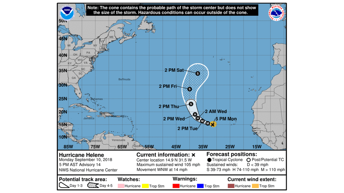Behind Isaac, Helene has strengthened with maximum sustained winds estimated to be at 105 mph. Helene is expected to continue strengthening over the next two days as it rolls west and become a major, Cat 3 hurricane over the next 12 to 24 hours, with sustained winds of 115 mph. It’s likely to continue west for the next two days, but then turn to the northwest, parallel and far from the U.S. coast, when Isaac knocks an opening into a steering ridge.