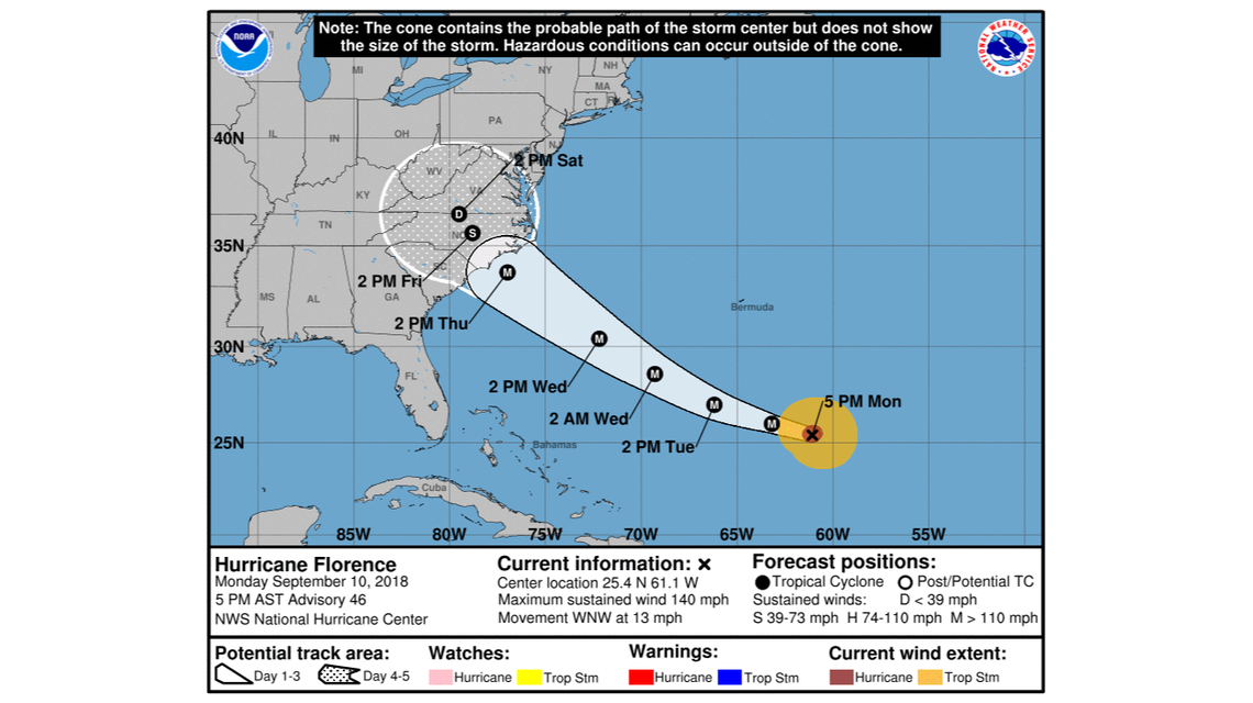 In a 5 p.m. update, National Hurricane Center forecasters said sustained winds had increased to 140 mph, with the storm likely to make landfall along the North or South Carolina coast by Thursday. Hurricane-force winds doubled over 12 hours, extending 40 miles from the storm’s center by Monday evening. As it nears the U.S. coast, winds speeds could rise and fall as the intense storm undergoes eyewall replacements, broadening the storm and increasing the areas potentially impacted even more.