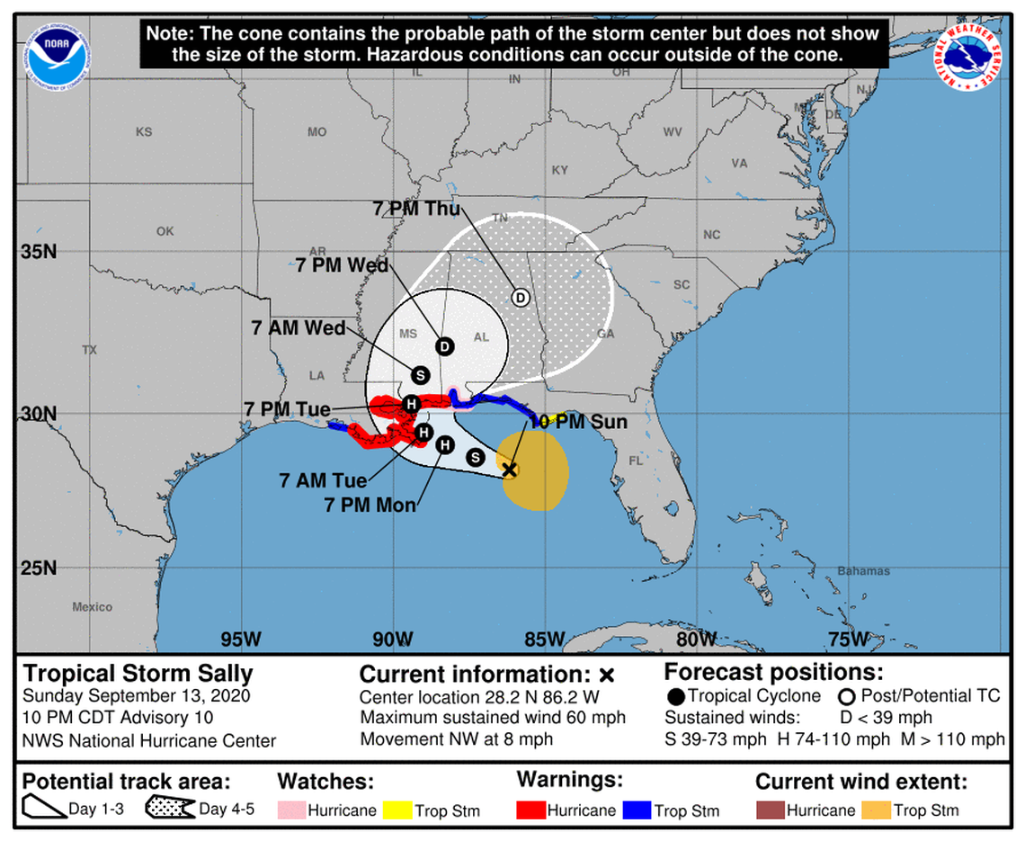 Sally has sustained winds of 60 miles per hour, according to the National Hurricane Center’s 10 p.m. update Sunday, and could reach southeastern Louisiana as early as Monday night. The hurricane center said storm surge of up to 11 feet is possible near the center of the storm along the mouth of the Mississippi River to Ocean Springs, Mississippi.