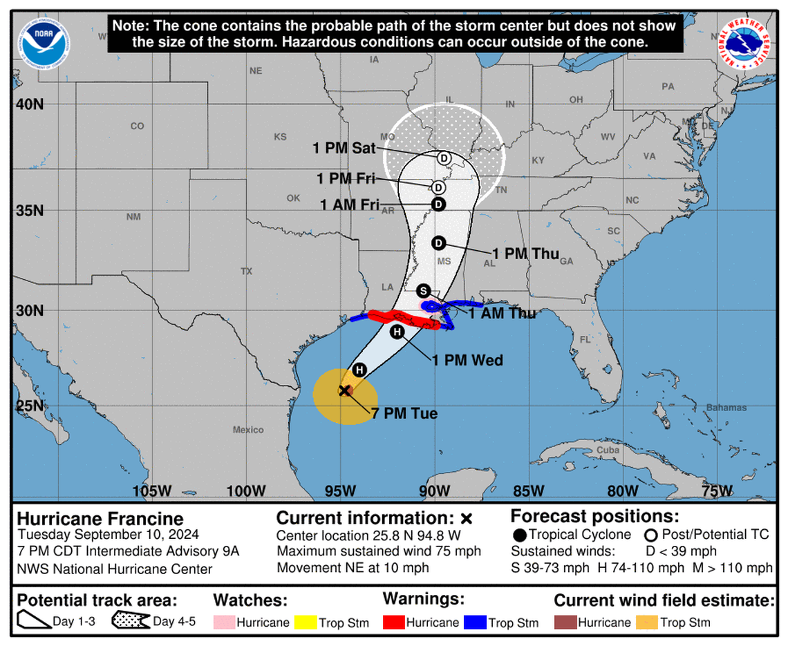 As of the 8 p.m. advisory, Francine had maximum sustained winds of 75 mph and was about 350 miles southwest of Morgan City, Louisiana.