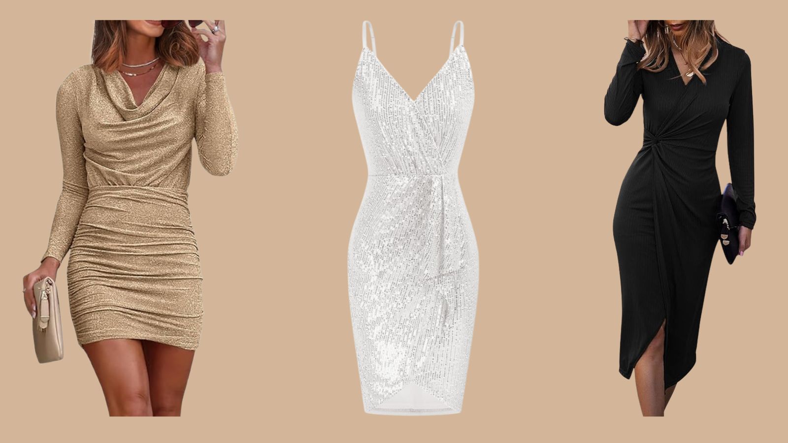 - Gold is an underrated holiday staple. Sparkle in this shimmery cowl neck dress, and pair it with a gold heels and a clutch for the ultimate holiday touch.