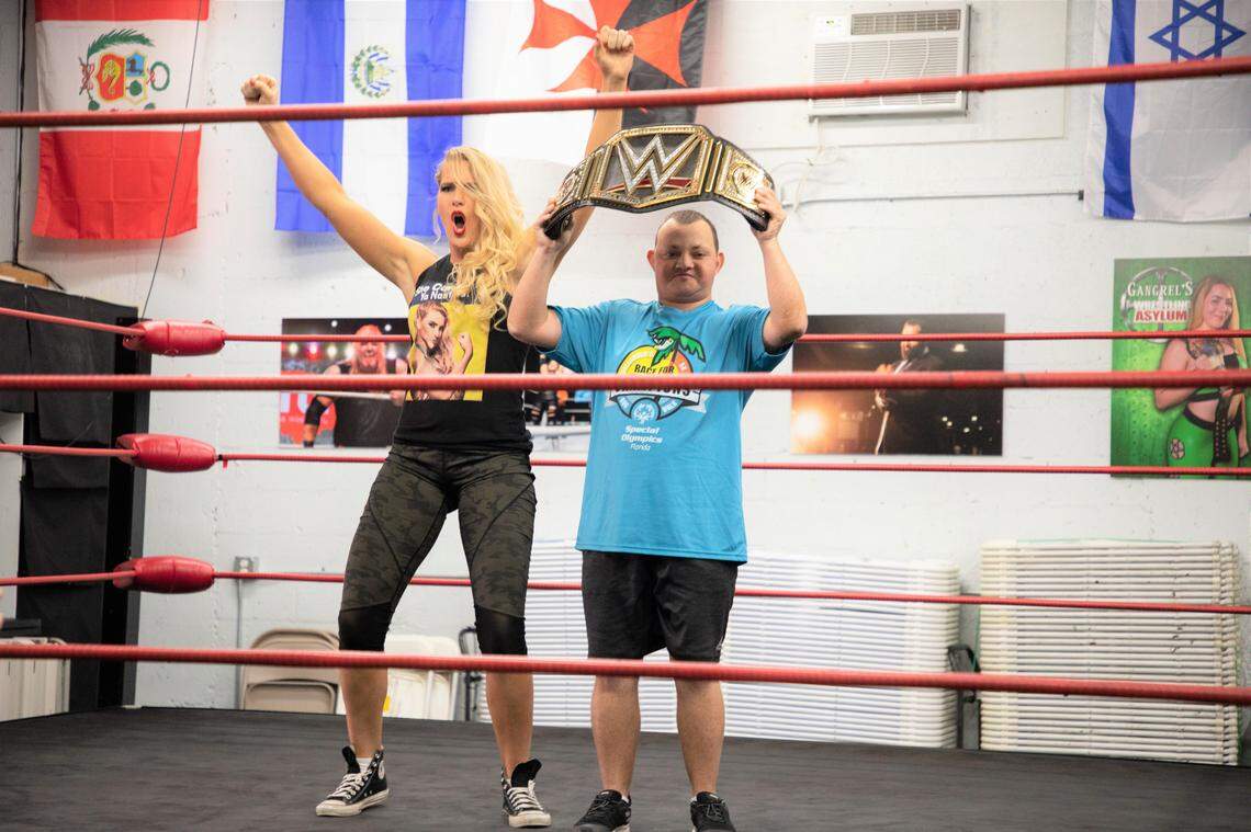 During the week, Evans (along with Edmonds) presented a WWE championship belt to Corey Hixon at Gangrel’s Wrestling Asylum training center in nearby Dania Beach.