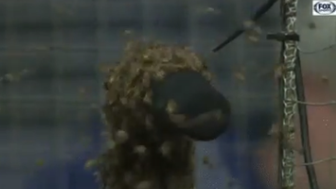 A swarm of bees have taken home to a microphone attached to netting behind home plate and just to the side of the Padres dugout.