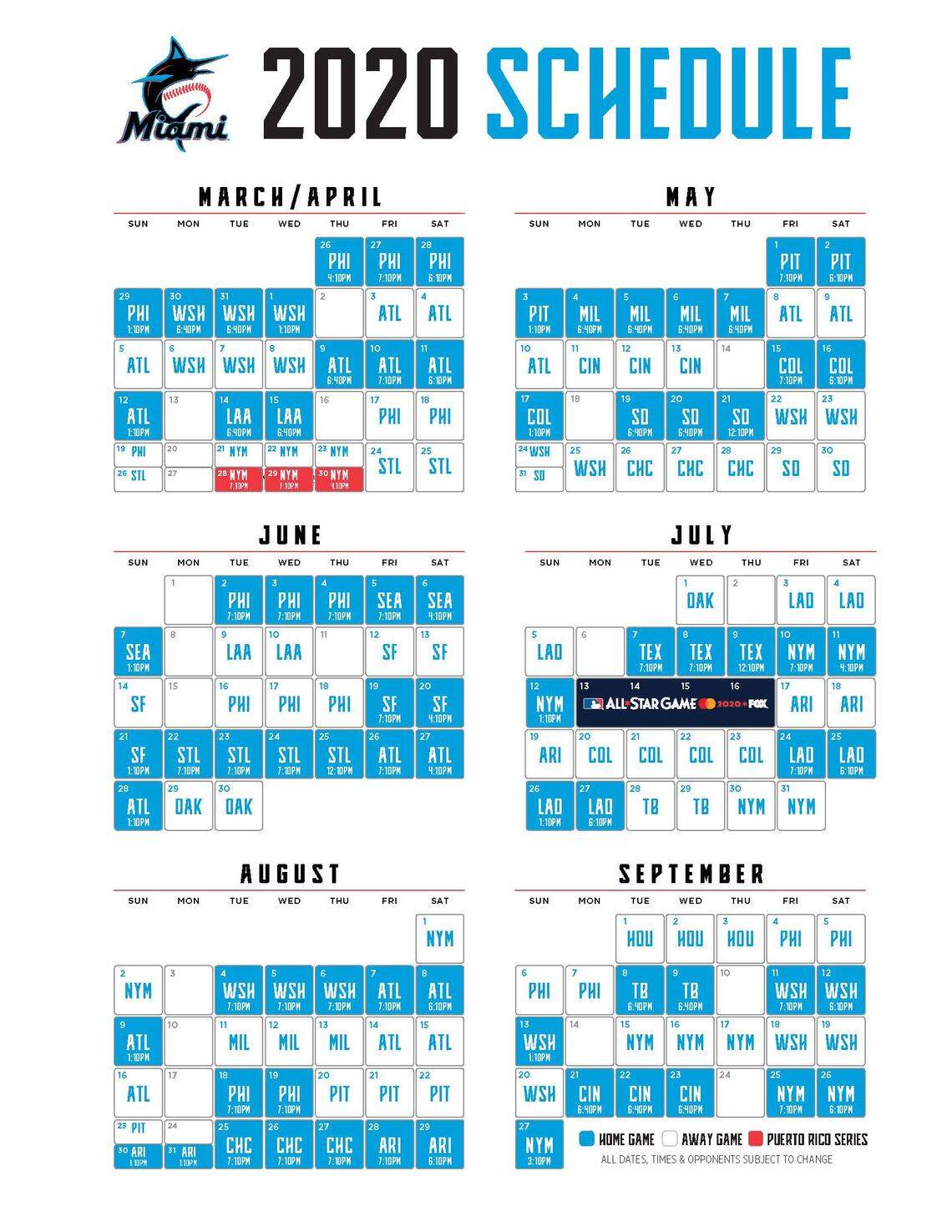 In addition to playing in Puerto Rico at the end of April, the Marlins will open and close the 2020 season at home. The season begins with a six game homestand against the Philadelphia Phillies (March 26-29) and the Washington Nationals (March 30-April 1). It concludes with six games at home against the Cincinnati Reds (Sept. 21-23) and New York Mets (Sept. 25-27).