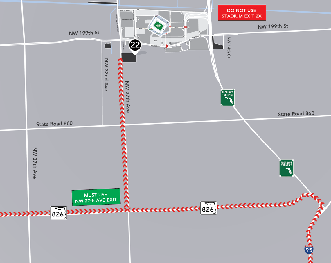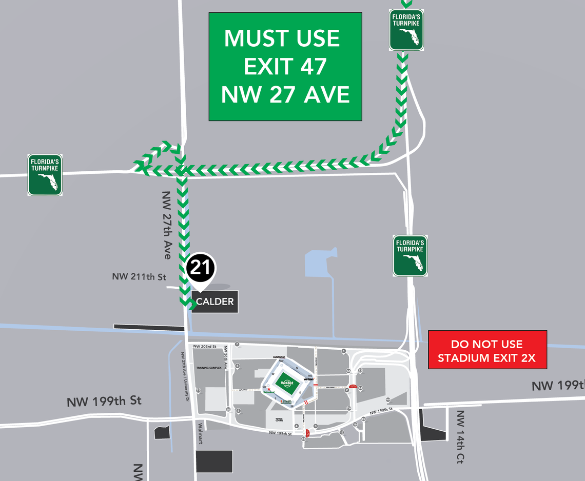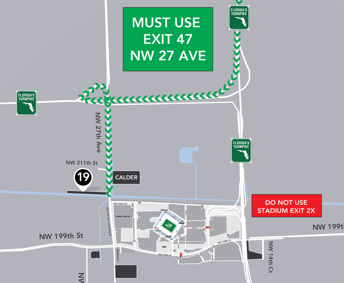 Fans coming from north of Hard Rock Stadium can park in Lot 19 and are advised to use Exit 47 NW 27th Avenue.