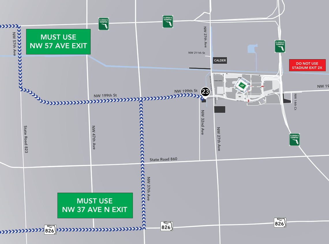 Fans coming from west of Hard Rock Stadium can park in Lot 23 and are advised to use the NW 57th Avenue exit or NW 37th Avenue North exit.