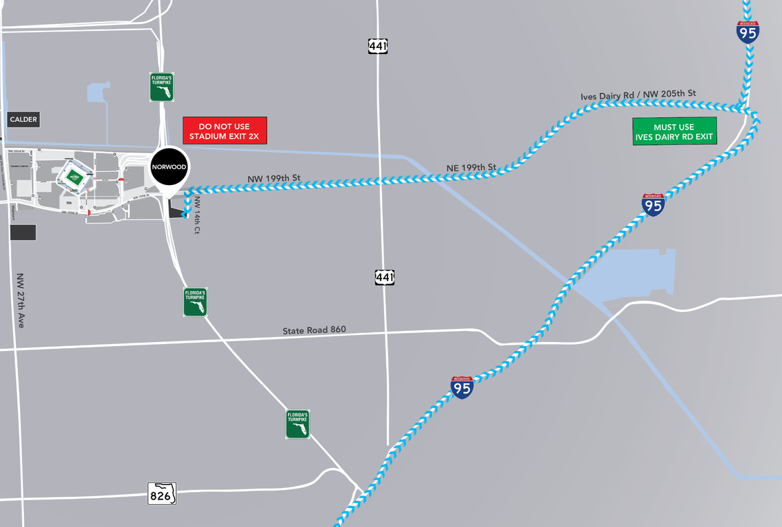 Fans coming from east of Hard Rock Stadium can park in the Norwood lot and are advised to use Ives Dairy Road exit.