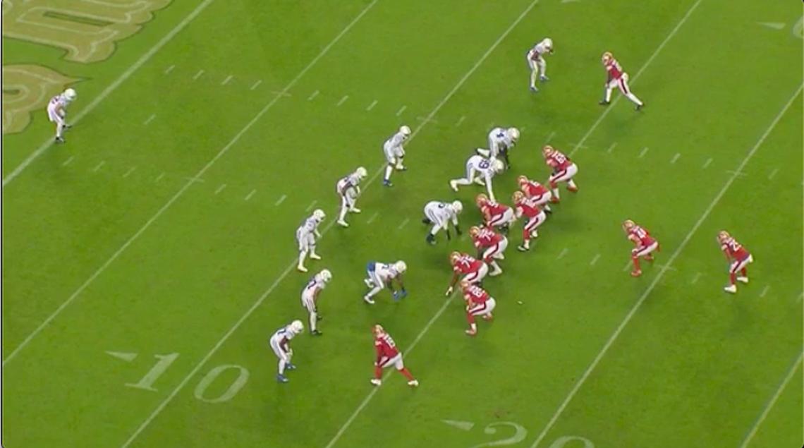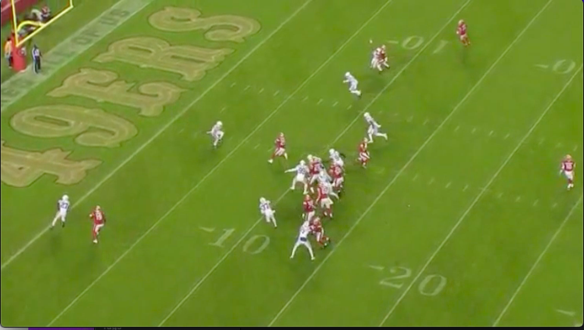 In the split zone concept, the running back doesn’t take the ball at as wide of an angle as the outside zone run. But a player, usually a tight end or fullback, comes across the face of the play — in the opposite direction of the linemen and back — to block a backside defender. The misdirection aims to confuse the second-level defenders and still create a crease for a cutback lane. The 49ers used this concept in a Week 7 game against the Indianapolis Colts. Tight end George Kittle flows against the moving linemen to seal a defender in pursuit and that block springs the cutback lane for a touchdown.