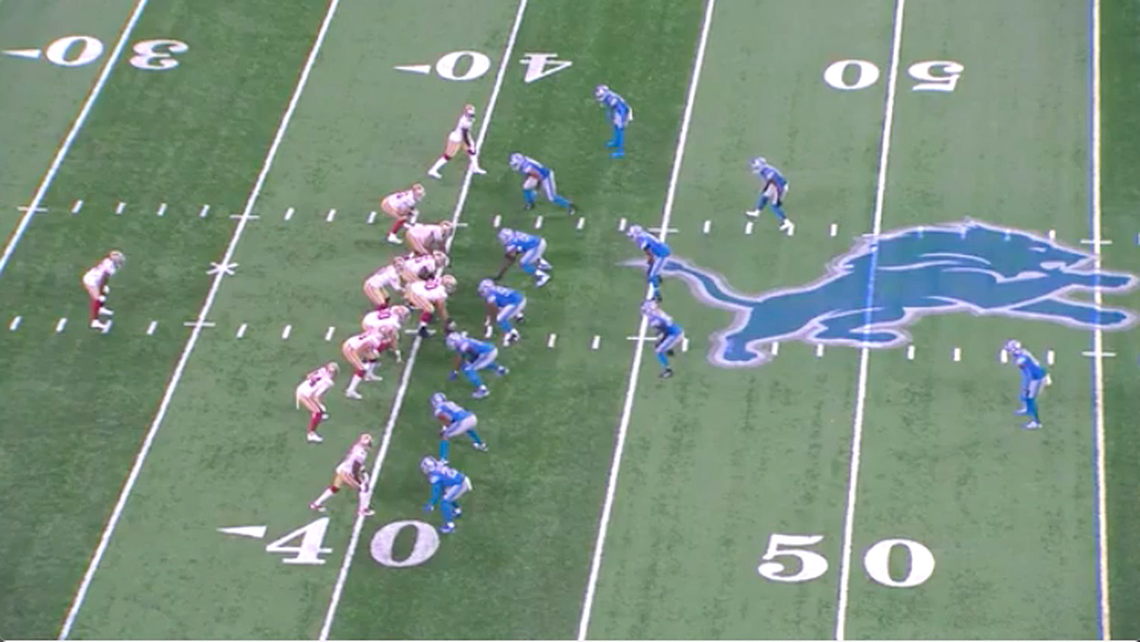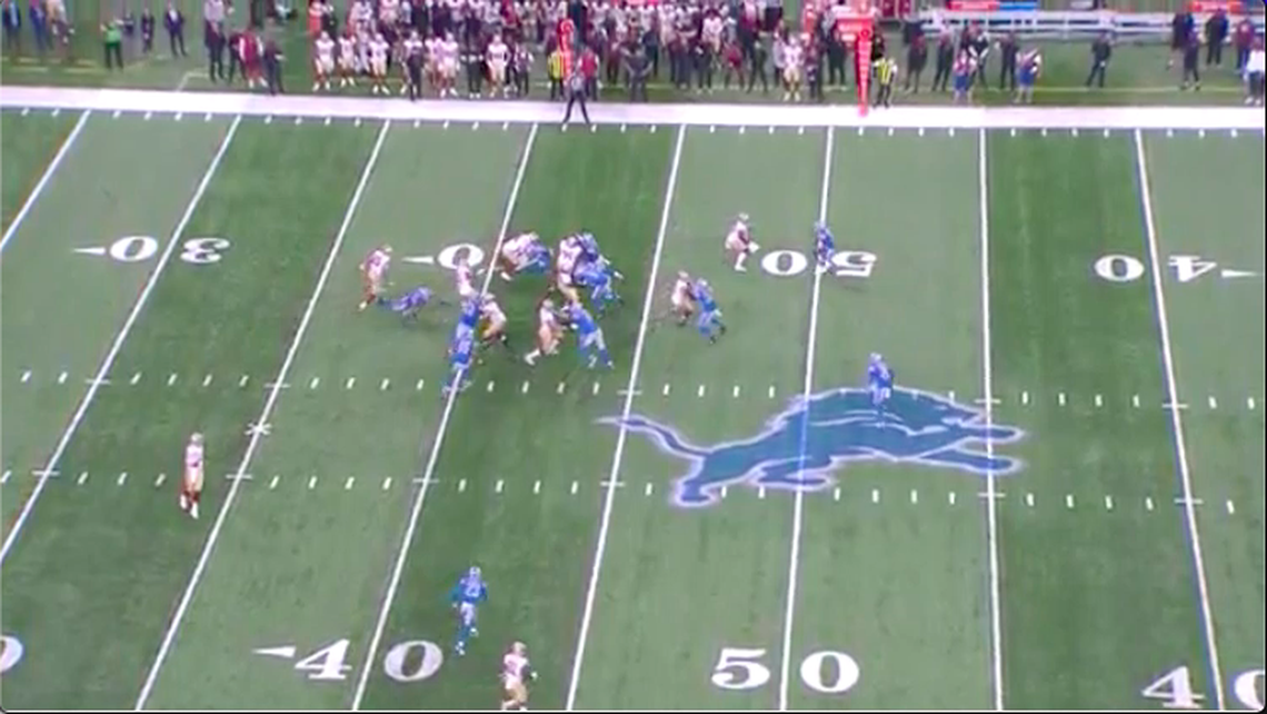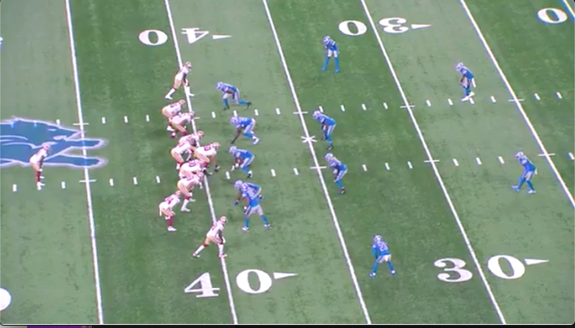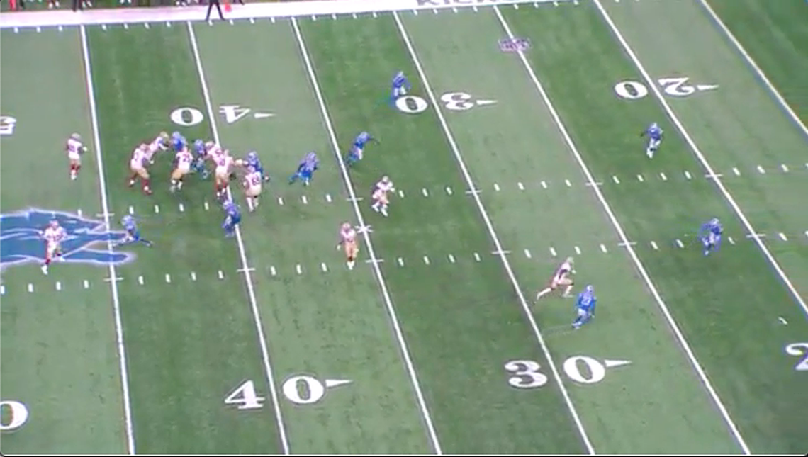In the 49ers’ Week 1 game against the Detroit Lions, they run an outside zone concept with a handoff to Elijah Mitchell. At the snap, all five linemen step laterally to the right, completing their blocking assignments. The flow of bodies allows Mitchell to cut upfield and work to the left, where defenders have vacated their spots, for a sizable gain.