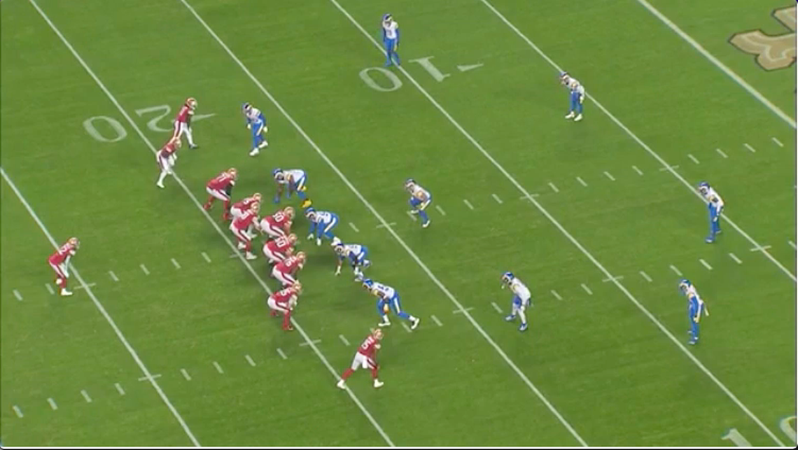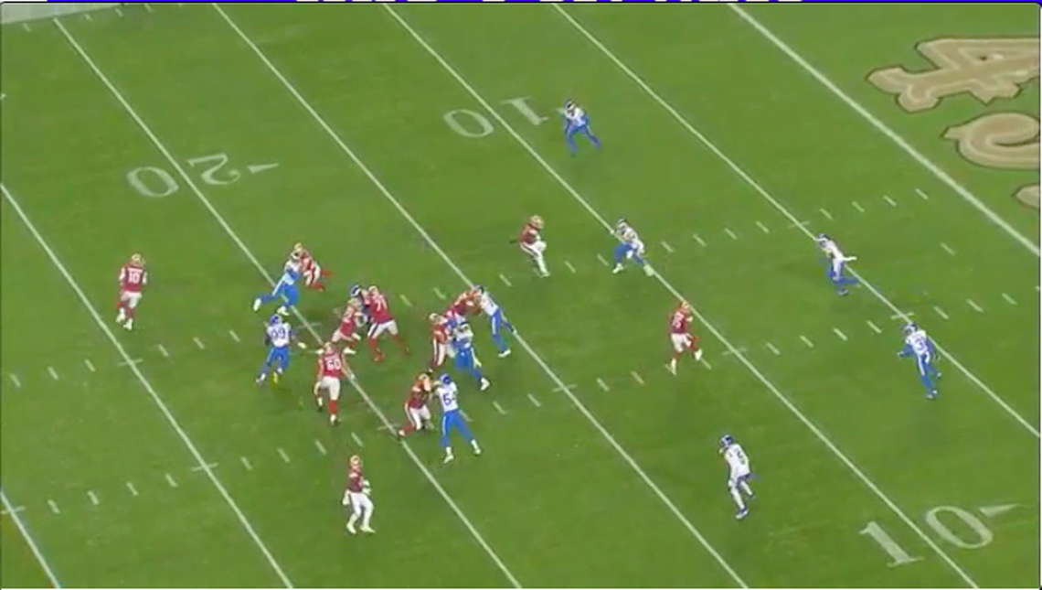 In some situations, McDaniel will call for a pitch play but instead of tossing the ball horizontally, the quarterback will toss it vertically right to the running back. The linemen will still block for a zone run but with the allusion of an outside toss. If defenders pursue the edge too much and vacate their spots, a cutback lane should be available. San Francisco ran this play in Week 10 against the Los Angeles Rams, with Kittle once again cutting across in a split zone concept.