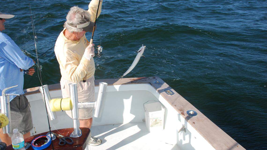 For the next two hours, we emptied Sherman’s tackle box of every rusted spoon, beat-up jig and corroded crankbait he owned. Whenever the bite slowed, we waited 30 seconds for the roaming mackerel to start jumping and headed over.