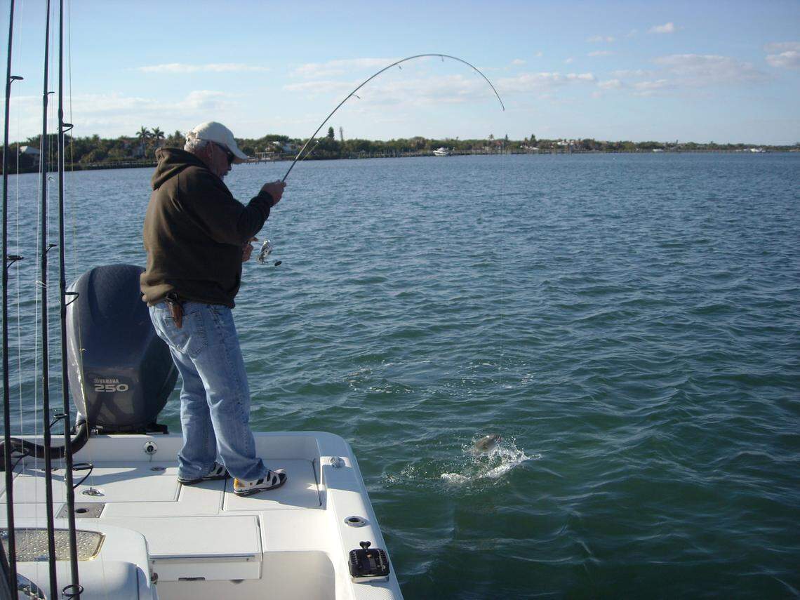 I took my father, Lloyd, fishing with Mark Nichols, the founder and owner of D.O.A. Lures in Stuart at Peck’s Lake, where it’s easy to locate the mackerel: Just look for the commercial boats cast-netting the fish, which is legal.
